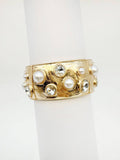 Gold Hammered Stretch Bangle with Pearl and Clear Crystal Accents