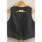 Add a touch of classic elegance to your outfit with this tailored button-down vest. Features a v-neckline, sleeveless cut, and a streamlined silhouette with functional front buttons. Perfect for layering over blouses, dresses, or stylish tops to create a polished look. Self: 70% Polyester 26% Rayon 4% Spandex Lining: 95% Polyester 5% Spandex Model Is 5' 9" Tall, 32" Chest, 23" Waist, 35" Hips And Wearing A Size Small I