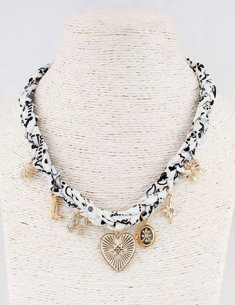 White and Black Braided Scarf Necklace with Heart, Bow, and Boot Charms