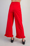 These pants showcase a high rise fit with a clean back zipper closure, oversized front patch pockets, and straight legs finished with playful ruffled hems for a charming, statement making touch.