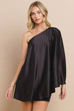 One shoulder satin mini dress, with an asymmetric neckline and loose, draped sleeve design.