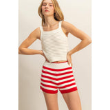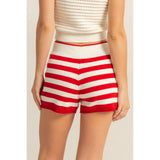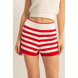 This Striped Sweater Shorts Makes The Perfect Summer Outfit. The Shorts Have A Striped Pattern And Offer A High-Rise Cut With Fitted Short Legs. 50% Rayon 28% Polyester 22% Nylon Model Is 5' 9" Tall, 32" Chest, 23" Waist, 35" Hips And Wearing A Size Small