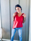 95% POLYESTER 5% SPANDEX SLEEVELESS V NECK FAUX LEATHER TOP WITH RUFFLED DETAIL MODEL SIZE: HEIGHT 5'4", 120 pounds wearing a small.