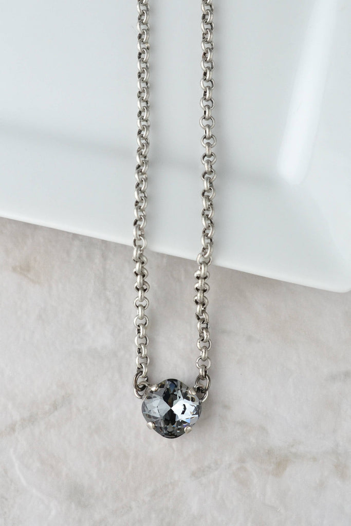 12mm Cushion Cut Necklace. Wear with your favorite V-neck tee, scoop neck tank or with a button-down (top button undone). -Oxidized silver finish over brass base -18/20" chain length -Lobster clasp closure Care for your jewelry by simply wiping it down with a cotton cloth after wearing. Never wear the jewelry in water and put it on after you have already applied make-up, hairspray and lotion. Our jewelry has a patina finish that tends to darken over time. The best way to store your jewelry is with an anti tarnish 3M square and away from Sterling jewelry that tends to oxidize more quickly.