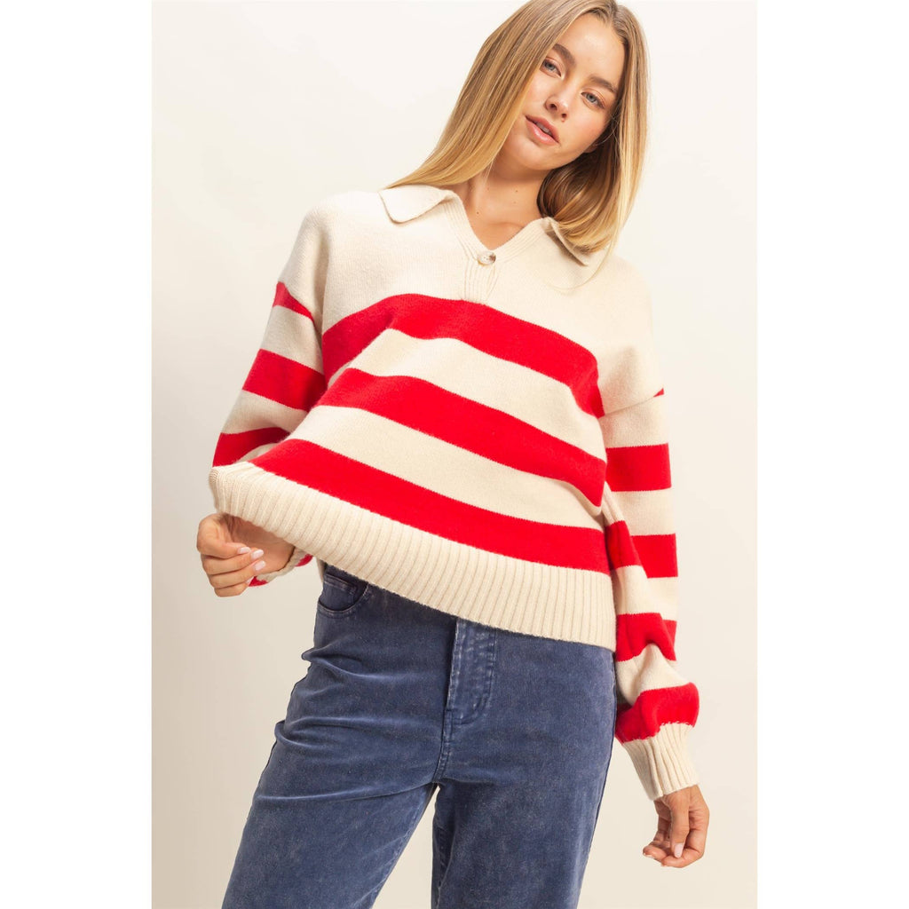 This cozy sweater features a polo collar with a two-button buttons, offering a relaxed fit perfect for versatile styling. Its horizontal stripes add a dynamic visual interest, making it ideal for layering or as a standout piece on chilly days. Pair it with denim for a casual look or dress pants for a more refined ensemble.