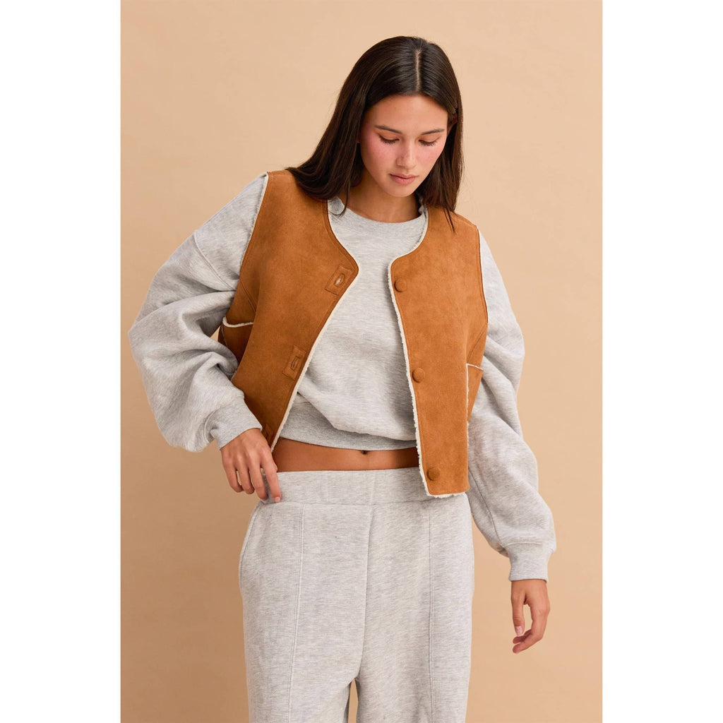 Crafted from suede fabric, this sleeveless vest features a button-front closure and patch pockets. Offering both style and comfort, it's perfect for layering during the cooler seasons. Pair with a turtleneck and fitted jeans for a casual outing, or dress it up with tailored trousers and a blouse for an elegant look. 95% polyester 5% spandex Model Is 5' 7" Tall, 32" Chest, 25" Waist, 36" Hips And Wearing A Size Small Imported. Designed In The USA