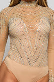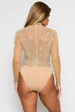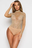 Rhinestone Mock Neck Long Sleeve Bodysuit: Nude / L